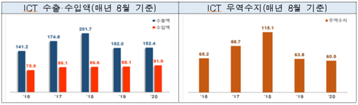 8월 ICT 무역 수지는 60억5000만 달러 흑자로, 반도체(38억8000만 달러), 디스플레이(14억8000만 달러), 휴대전화(1억4000만 달러) 등 부문에서 흑자를 보였다.
