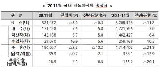 산업통상자원부가 14일 발표한 11월 자동차산업 월간 동향에 따르면, 지난달 국내 자동차 생산은 32만4472대로 전년동월 대비 -6.3% 급락했다.