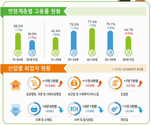 반면, 정부의 공공일자리사업 영향으로 공공행정·국방 및 사회보장행정 취업자는 15만2000명(+13.6%) 증가했다. 보건업 및 사회복지서비스업(11만4000명, 5.0%), 건설업(7만7000명, 3.7%) 취업자도 증가했다.