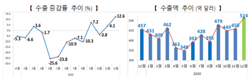 지난달 수출이 전년 대비 12.6% 증가해 역대 12월 중 최고 수출액을 기록했다. 하지만 코로나19 영향으로 연간 수출은 5.4% 감소했다.