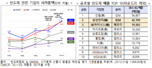 이러한 향후 시장 전망이 자본시장에 반영돼 지난해 12월말 종가 기준 삼성전자 시가총액이 5001억불로 TSMC(4881억불)를 제치고 5개월 만에 글로벌 반도체 시가총액 1위에 다시 올랐다. SK하이닉스의 경우 매출에서 인텔·삼성에 이어 세계 3위를 기록하고 있으며, 향후 인텔 낸드부문 인수로 인한 컨트롤러 경쟁력 강화가 기대된다.