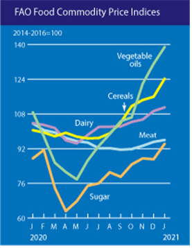 농축산식품부는 국제연합식량농업기구(FAO)를 인용해 2021년 1월 세계식량가격지수가 전월(108.6포인트) 대비 4.3% 상승한 113.3포인트를 기록했다고 7일 밝혔다. FAO 식량가격지수는 8개월 연속 상승하며 1년 전보다는 10.5% 올랐다. FAO는 1990년 이후 24개 품목의 국제가격동향을 모니터링해 5개 품목군(곡물, 유지류, 육류, 유제품, 설탕)별 가격지수(2014~2016년 평균 = 100)를 작성해 매월 발표한다.