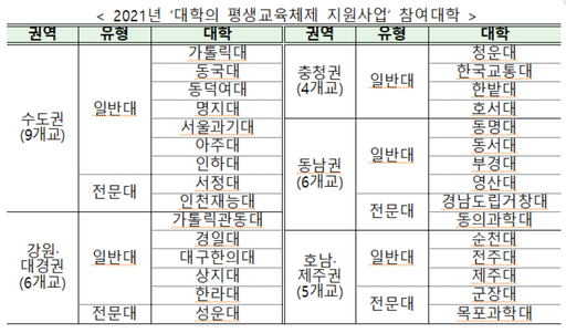교육부는 이 같은 내용의 '2021년 대학의 평생교육체제 지원사업(LiFE사업)'에 참여할 대학 30개교를 30일 발표했다.