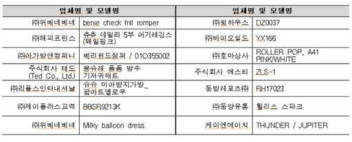 적발된 제품 중에는 지퍼에서 납이 기준치를 2.6배 초과한 아동 수영복, 지지대 플라스틱 부위에서 프탈레이트계 가소제가 기준치를 347배 초과한 우산, 바퀴의 내구성이 안전기준에 미달한 바퀴달린 운동화 등 여름의류 등 14개 제품이 포함됐다. 또 프탈레이트계 가소제가 기준치를 141개 초과한 어린이용 아쿠아 스티커, 머리에 닿지 않는 금속 장식부분에서 카드뮴이 기준치를 수천배 이상 초과한 아동용 머리띠 등 완구·장신구 등 17개 제품이 적발됐다.