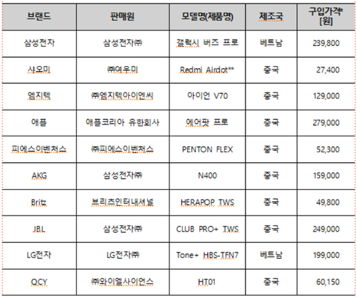 비교 평가된 제품은 삼성전자(갤럭시 버즈 프로), 샤오미(Redmi Airdot), 엠지텍(아이언 V70), 애플(에어팟 프로), 피에스이벤처스(PENTON FLEX), AKG(N400), Britz(HERAPOP TWS), JBL(CLUB PRO+ TWS), LG전자(Tone+ HBS-TFN7), QCY(HT01)(가나다순)이다.