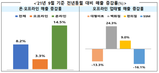 산업통상자원부가 28일 발표한 2021년 9월 주요유통업체 매출동향에 따르면, 지난달 매출은 온프라인(3.3%)과 온라인(14.5%) 모두 성장세를 이어가 전년동월 대비 8.2% 상승했다.