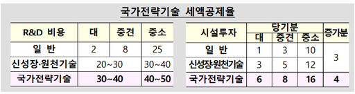 우선, R&D와 시설투자시 세제혜택을 대폭 확대한 '국가전략기술'을 운영한다. 그간 기술평가 등을 거쳐 선정된 반도체·배터리·백신 등 3대 분야 65개 기술을 내년 2월 국가전략기술로 첫 지정할 예정이다. 일정비율 이상 국가전략기술 제품과 일반제품 생산에 병행 사용되는 공통시설 투자에 대해서도 2월부터 국가전략기술 시설투자 세제지원을 허용한다.