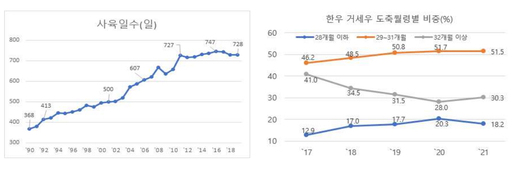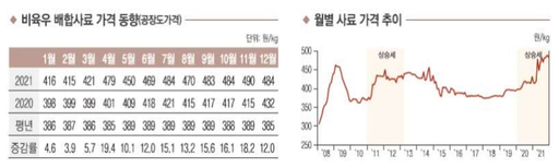 곡물을 먹여 키우는 비육우 사육일수는 2000년 495일(약 17개월)에서 2010년 658일(약 22개월), 2020년 729일(약 24개월)로 증가하고 있다. 여기에 송아지 기간(약 6개월)을 더 할 경우 사육일수는 2020년 기준 30개월이다. 비육우용 배합사료 가격은 같은기간 kg당 211원에서 370원, 412원으로 올랐고, 지난해 463원으로 증가했다. 올해는 러시아의 우크라이나 침공이 발생하며 국제 곡물가격이 급등했고 kg당 500원대를 넘어선 것으로 추정된다.