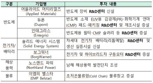 반도체 분야에선 글로벌 반도체장비 1위 기업인 어플라이드 머티리얼즈가 반도체 장비 R&D센터를 신설하고 듀폰은 반도체 소재 관련 R&D센터와 제조시설을 증설한다.