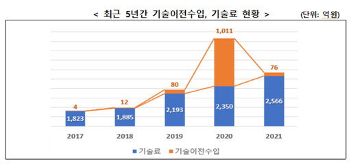 기술이전의 대가로 공공연구기관이 받은 기술료 수입은 총 2566억원으로 직전년도(2350억원) 대비 9%(216억원) 증가해 역대 최대치를 기록했다. 5년간 연평균 증가율은 8.9%로 증가 추세가 지속되고 있다.