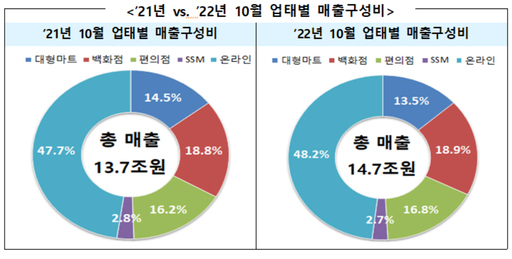 산업통상자원부가 29일 발표한 2022년 10월 주요 유통업체 매출 동향에 따르면, 지난달 매출은 14조7000억원으로 전년동월(13.7조원) 대비 7.3% 증가했다.