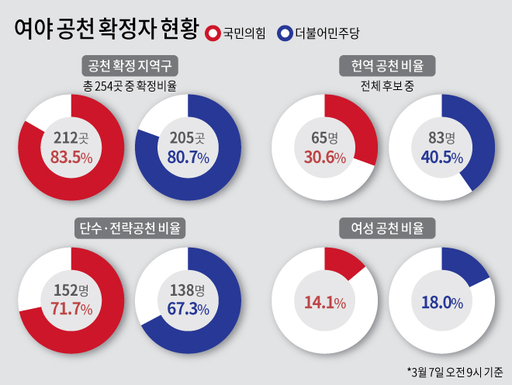 먼저, 국민의힘을 살펴보면 여당은 이날 오전 기준으로 254개 선거구 중 212곳에 후보를 확정했다. 이들은 단수·전략공천이나 경선을 거친 이들이다. 이중 현역의원은 65명으로, 전체 후보(212명) 중 30.6%를 차지했다.