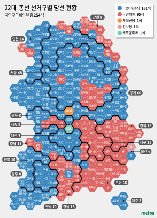 국민의힘은 서울에서는 11석, 경기 6석, 인천 2석을 차지해 19석에 그쳤다. 다만 지난 21대 총선에 비해 서울에서 도봉갑, 마포갑, 동작을 등 3석을 더 확보한 것이 눈에 띈다.