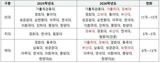 19일 대학가와 진학사에 따르면, 올해 의대 정시모집에서는 전체 39개 대학 중 15개교(38.5%)가 사탐 응시를 허용한다. 가톨릭대·경북대·부산대는 수학·탐구 지정과목을 모두 폐지했고, 고려대도 탐구에 한해 유지하던 지정과목을 없애 필수 응시과목이 사라졌다. 이에 따라 올해 가톨릭관동대, 가톨릭대, 경북대, 경희대, 고려대, 동아대, 부산대, 성균관대, 순천향대, 아주대, 연세대, 이화여대, 인하대, 중앙대, 한양대 의대가 사탐 선택자도 지원할 수 있도록 문을 열었다.
