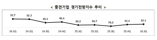 2일 한국중견기업연합회가 발표한 '2026년 1분기 중견기업 경기전망조사'에 따르면 중견기업 1분기 경기전망지수는 직전 분기 대비 0.7포인트(p) 오른 82.1로 2분기 연속 상승했다.