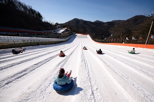 양주시 장흥자연휴양림에 위치한 양주눈꽃축제 눈썰매장, 주말을 맞아 많은 관광객들이 방문하여 눈썰매를 타며 겨울의 정취를 만끽하고 있다.