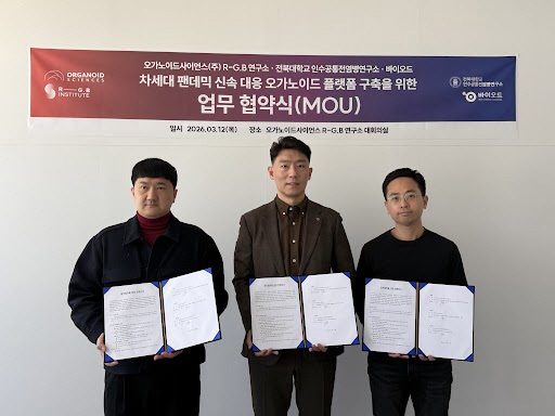 오가노이드사이언스는 전북대학교 인수공통전염병연구소, 주식회사 바이오드와 함께 차세대 감염병 대응 오가노이드 플랫폼 구축을 위한 업무협약(MOU)을 체결했다고 12일 밝혔다.
