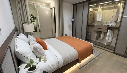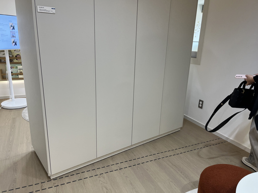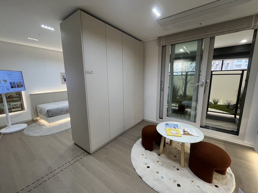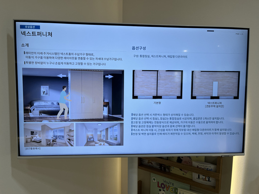 특히 많은 이들의 관심을 끈 인테리어는 래미안의 대표 상품 '넥스트퍼니처'다. 이동식 수납가구를 활용해 방 구조를 바꿀 수 있는 미래형 주거 기술이다. 전시된 84㎡A 유닛은 현관과 가까운 두 개 침실에 이 옵션이 적용됐다. 기본 구조는 두 방이 분리돼 있지만 넥스트퍼니처 옵션을 선택하면 침실이 하나로 합쳐진다. 이때 움직이는 가구를 통해 공간을 자유롭게 재구성할 수 있다. 가구 아래 숨겨진 바퀴가 있어서 특별한 장비 없이 쉽게 움직이는 게 가능하다. 현장에서 이를 직접 본 방문객들은 "바퀴가 안 보이는데 가구가 움직이고, 방을 합쳐 쓰거나 나눌 수 있는 점이 신기하다"며 관심을 보였다.