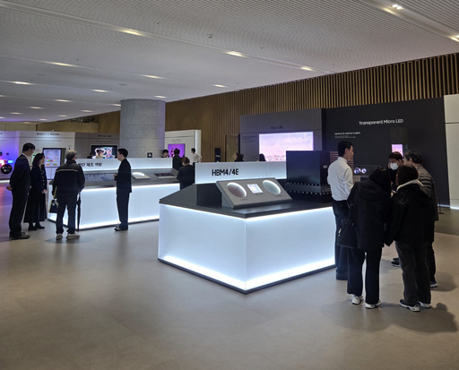 주총장 로비에는 삼성전자의 차세대 기술과 제품이 전시돼 AI 반도체 경쟁력을 과시했다. 전시공간에는 HBM4와 엑시노스2600 등 차세대 반도체 기술을 비롯해 갤럭시 S26, 갤럭시 Z 트라이폴드(TriFold), 비스포크 AI 가전, 마이크로 RGB TV, 투명 마이크로 LED 등이 공개됐다.