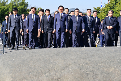 이날 봉하마을 방문에는 정 대표 외에 당 지도부가 함께했다. 이들은 노 전 대통령 묘역에 헌화한 뒤 권양숙 여사를 비공개 예방했다.