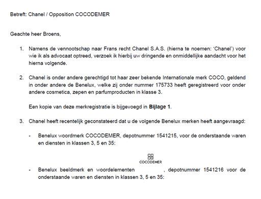 네덜란드 현지 유통사를 통해 COCODEMER와 관련해 두 건의 상표를 출원했는데 샤넬을 대리하는 로펌(Banning)측으로부터 "샤넬은 국제적으로 매우 유명한 상표인 'COCO'의 정당한 권리자이며 해당 상표는 베네룩스 지역을 포함해 여러 국가에 등록돼 있다"는 내용이 담긴 문서가 날라왔다.