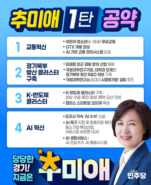 추 후보는 30일 보도자료를 통해 ▲교통혁신 ▲경기북부 방산클러스터 구축 ▲K-반도체 클러스터 완성 ▲AI 혁신 등 4대 핵심 비전을 제시하며 본격적인 정책 행보에 나섰다.