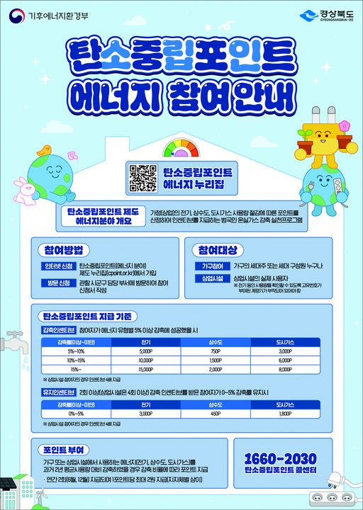 경북도는 전기와 상수도, 도시가스 사용량 절감과 자동차 주행거리 감축 실적에 따라 인센티브를 제공하는 '탄소중립포인트제(에너지·자동차 분야)' 참여자를 모집한다고 밝혔다.