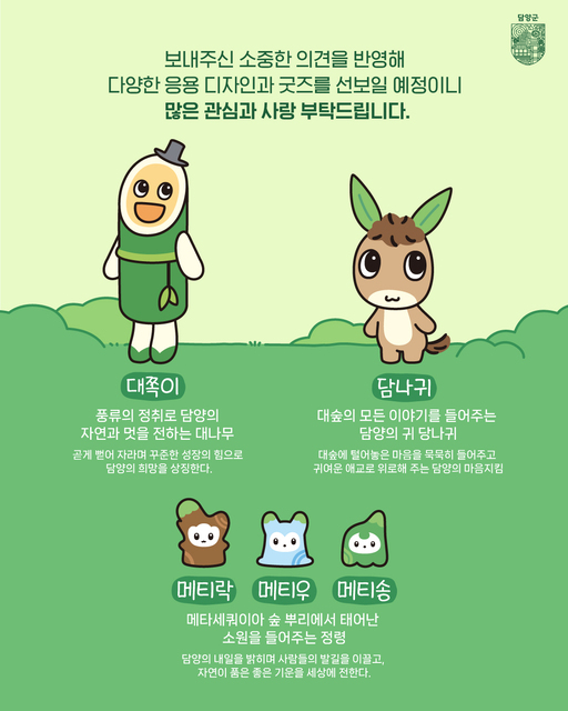 군 관계자는 "많은 분이 직접 참여해 뽑아주신 캐릭터인 만큼, 담양을 대표하는 친근한 홍보대사 역할을 할 것"이라며 "앞으로 새 캐릭터들과 함께 더욱 생동감 넘치는 담양 관광 브랜드로 키워 나가겠다"고 말했다.
