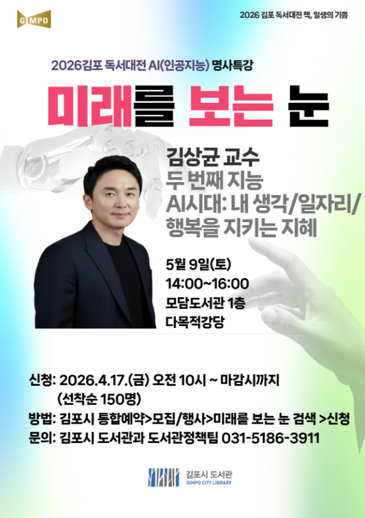 김포시는 '2026 김포 독서대전; 미래를 보는 눈: AI(인공지능)'을 주제로 김상균 교수의 명사특강을 오는 5월 9일 토요일 낮 2시 모담도서관에서 개최한다고 20일 밝혔다.